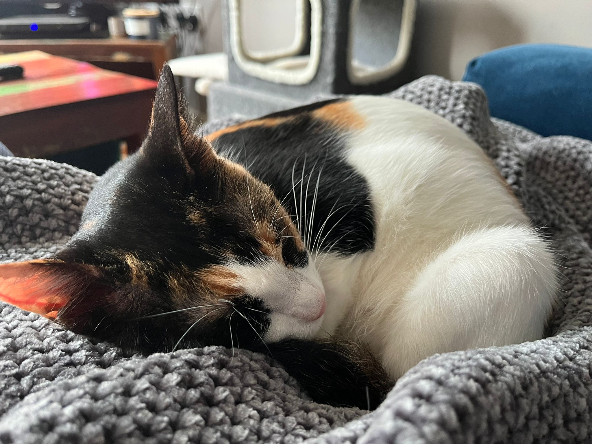 As soon as we brought Hope home, this girl began to emerge. We spent time sitting in the room we had created as a safe space, waiting patiently and quietly for her to explore us. Once she began to feel comfortable, she quickly offered forceful head bumps, a warm snuggle and the loudest purr you ever heard. She is now living with our two confident young boy cats and gives her brothers a run for their money.