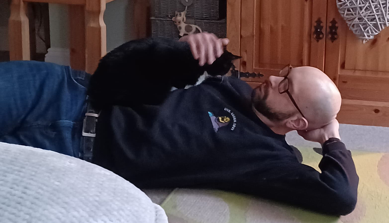 I picked her up on the Saturday morning, and if I am honest had a few reservations when she clung to Penny’s clothes, necklace and hair. I was instructed to try and not pet or over stimulate her when we got home – so difficult not to do when she was craving affection. She had a home in one of our bedrooms. Ate and drunk well from the off. However, got over excited playing and would go claws out, just dig into your skin. My son came in to see her and she hung off his beard!