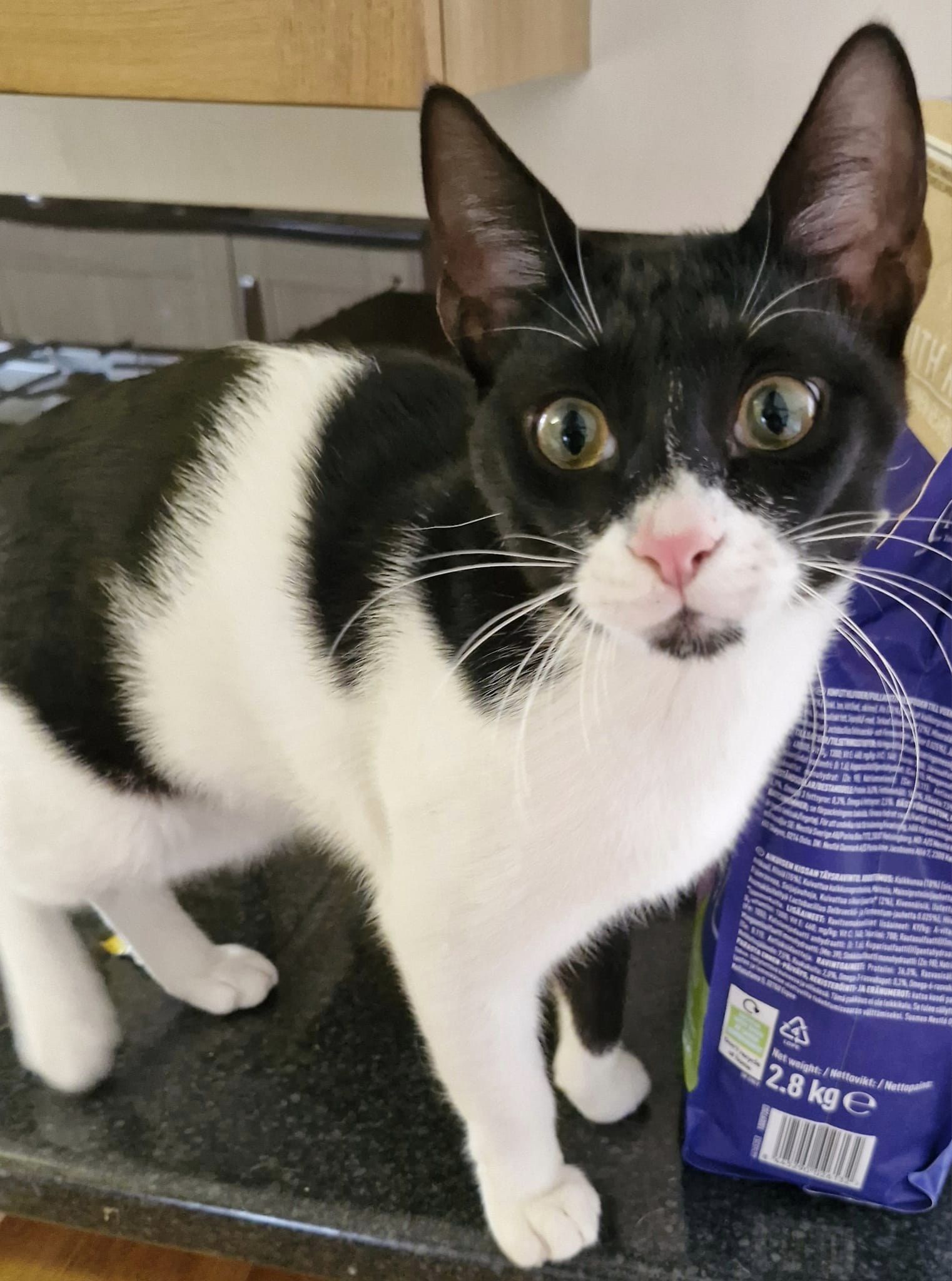 As you can see, I'm a striking looking black and white boy who comes complete with his own Zorro mask. I'm bouncy and very chatty and I'll jump onto your shoulder and travel around the house with you. Hmmm...maybe I'm also part parrot 🤔